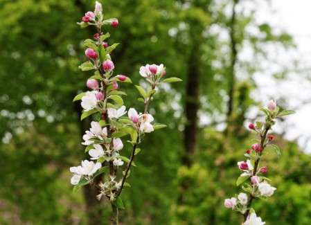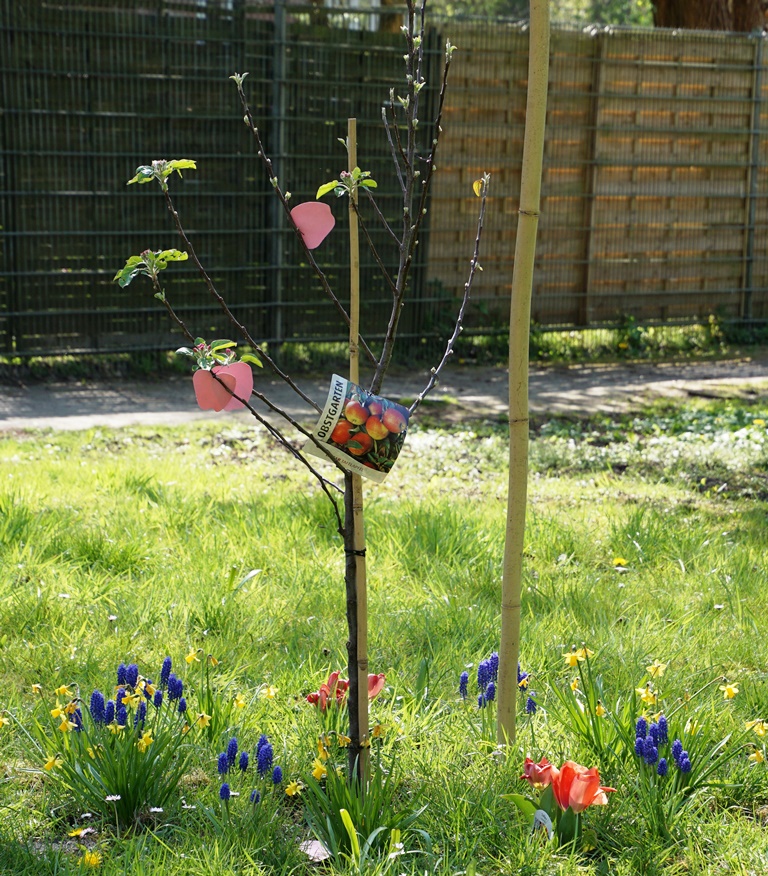 auf die zukünftige Obstwiese gepflanzt und Frühlingsblumen um den Baum gesetzt.